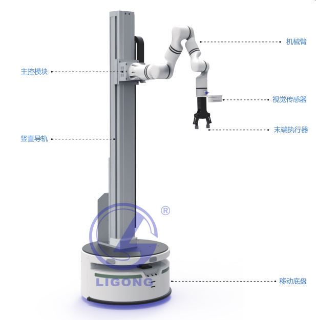 TYK-FR01型 人工智能機器人實訓(xùn)科研平臺將移動底盤、豎直導(dǎo)軌、機械臂、視覺傳感器、末端工具通過主控模塊集成于一體。與傳統(tǒng)的“機器人+AGV”形式的復(fù)合機器人相比,增加了升降系統(tǒng),進一步擴大了機器人的工作空間。同時在機械臂末端不僅配備了執(zhí)行工具,還集成了一款開源的3D視覺傳感器,來保證機器人在充足的工作空間下,具有更高的任務(wù)準(zhǔn)確性和靈活性。復(fù)合升降機器人為物流倉儲、無人貨柜等應(yīng)用場景,提供了一體化集成方案,實現(xiàn)機器人在結(jié)構(gòu)化場景內(nèi),進行無軌導(dǎo)航及路徑規(guī)劃,同時滿足三維空間作業(yè)能力的需求,實現(xiàn)全范圍、大空間的自主移動、自主動態(tài)抓取。