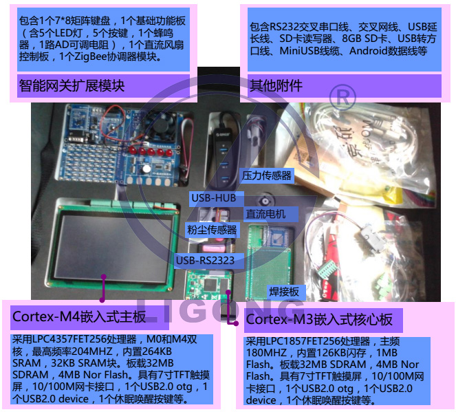 套件采用加厚的實驗箱,內(nèi)部由三層分別放置獨立模塊的海綿板組成。第一層主要放置兩種高性能網(wǎng)關(guān)、一種 M0 嵌入式控制板和三頻段的 RFID 模塊,分別是以 Cortex-A8 和 Cortex-A9 為核心的智能網(wǎng)關(guān)。第二層主要放置六種 ZigBee通信節(jié)點,以及多達 30 種傳感器模塊。傳感器模塊可隨時替換 ZigBee 通信節(jié)點的傳感器部分。第三層主要放置 M3、M4 架構(gòu)的嵌入式主板、高性能網(wǎng)關(guān)的四種擴展模塊、以及其他所需的傳感器和配線附件。