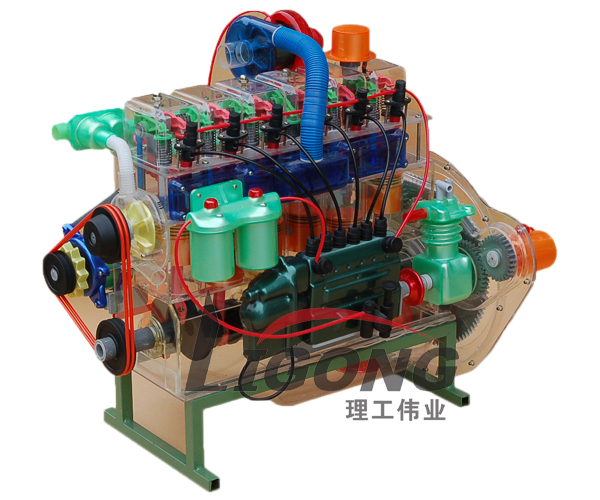 透明發(fā)動機模型外殼選用透明有機玻璃制作,內(nèi)部部件均以硬質(zhì)塑料料加工,用螺絲固定在金屬高溫烘漆而成的鐵架子上。總成部分都以壓模成形加工,代替過去膠粘合的方法,使產(chǎn)品在強度上有很大提高。發(fā)動機總成模型用直流電機驅(qū)動,能演示發(fā)動機內(nèi)部曲軸、活塞、氣門等運行情況,點火系統(tǒng)采用燈光演示,能根據(jù)實際發(fā)動機運行時的點火順序進行演示。