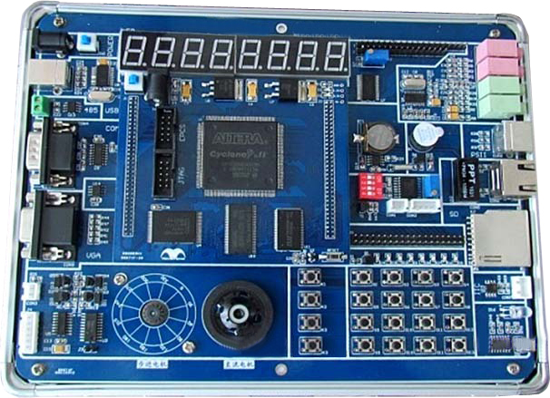 一、硬件資源 1、ALTERA Cyclone II EP2C20Q240C8芯片115萬(wàn)門(mén)。 核心板可以更換其它主芯片的核心板 2、1片64Mb FLASH芯片(32位總線操作,可兼容128Mb或256Mb Flash) 3、1片64Mb SDRAM芯片(可8位、16位、32位數(shù)據(jù)總線操作) 4、1片4Mb SRAM芯片16位總線(可升級(jí)為8Mb SRAM芯片) 5、1個(gè)10M以太網(wǎng)接口 6、VGA接口 7、SD卡媒體接口 8、1個(gè)RS232接口 9、1個(gè)USB轉(zhuǎn)232接口 10、1個(gè)RS485接口 11、LCD1602液晶屏接口 12、LCD12864液晶屏接口(支持YT-320*240 TFT彩色屏) 13、高性能立體聲音頻編解碼器TLV320AIC23:1路LINE-out、1路HP-out、1路MIC-in、1路LINE-in 14、8個(gè)共陰七段數(shù)碼管 15、8個(gè)LED指示燈 16、4個(gè)功能按鍵(button鍵) 17、4*4矩陣鍵盤(pán) 18、4路撥檔開(kāi)關(guān) 19、1路蜂鳴器 20、1個(gè)溫度傳感器 21、紅外收發(fā)器 22、1個(gè)直流電機(jī)驅(qū)動(dòng)(PWM) 23、1個(gè)四相步進(jìn)電機(jī)驅(qū)動(dòng) 24、1路PS/2鍵鼠接口 25、SPI EEPROM 93C46 26、IIC EEPROM 24C32 27、IIC總線8位AD...